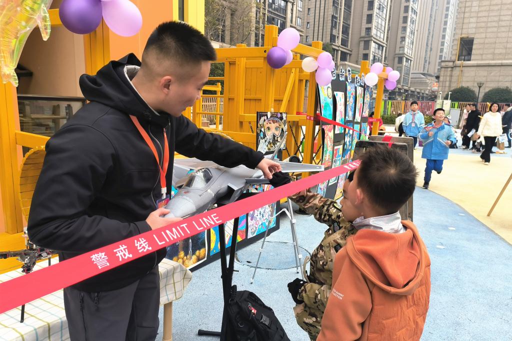表演结束后,航模队队员带着多款精心挑选的航空模型,为孩子们开展沉浸式讲解展示。队员们用浅显易懂的语言,向孩子们介绍了歼-20、翼龙Ⅱ、武直-10等模型的构造、飞行原理,耐心解答孩子们“飞机为什么能飞上天”“航模怎么控制方向”等天马行空的问题。孩子们围在模型旁认真聆听、伸手触摸,在看一看、听一听、问一问中,对航空知识有了初步认知,心中的航空梦悄然萌芽。