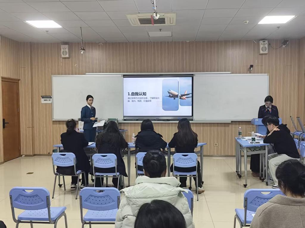 本次比赛分为成长赛道和就业赛道两部分,聚焦职业规划核心能力比拼,来自不同专业的16位选手按序登台,在限定时间内通过PPT展示结合现场讲解,完整呈现职业生涯规划关键内容。选手们从自我认知出发,结合航空服务、管理类相关行业趋势与岗位需求明确职业目标,同时拆解短期学业提升、中期实践锻炼、长期职业突破的具体路径,部分选手针对职业风险制定动态调整方案,体现对职业发展的系统性思考,四位专业老师组成的评审团围绕“职业目标”“学习实践行动”“优化改进”等五个维度评审,评委实时记录展示要点,赛后结合就业市场与行业需求集中点评,对存在的问题提出优化建议。