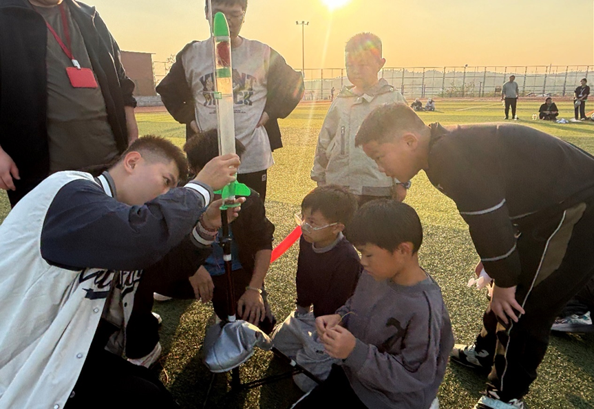 11月15日,在我院绿茵场上,伴随着孩子们整齐响亮的倒计时,两枚彩色模型火箭喷薄而起,拖曳着白色尾烟划破晴空。这是“天问”团队为新田小学学生精心策划的沉浸式航天体验环节之一。