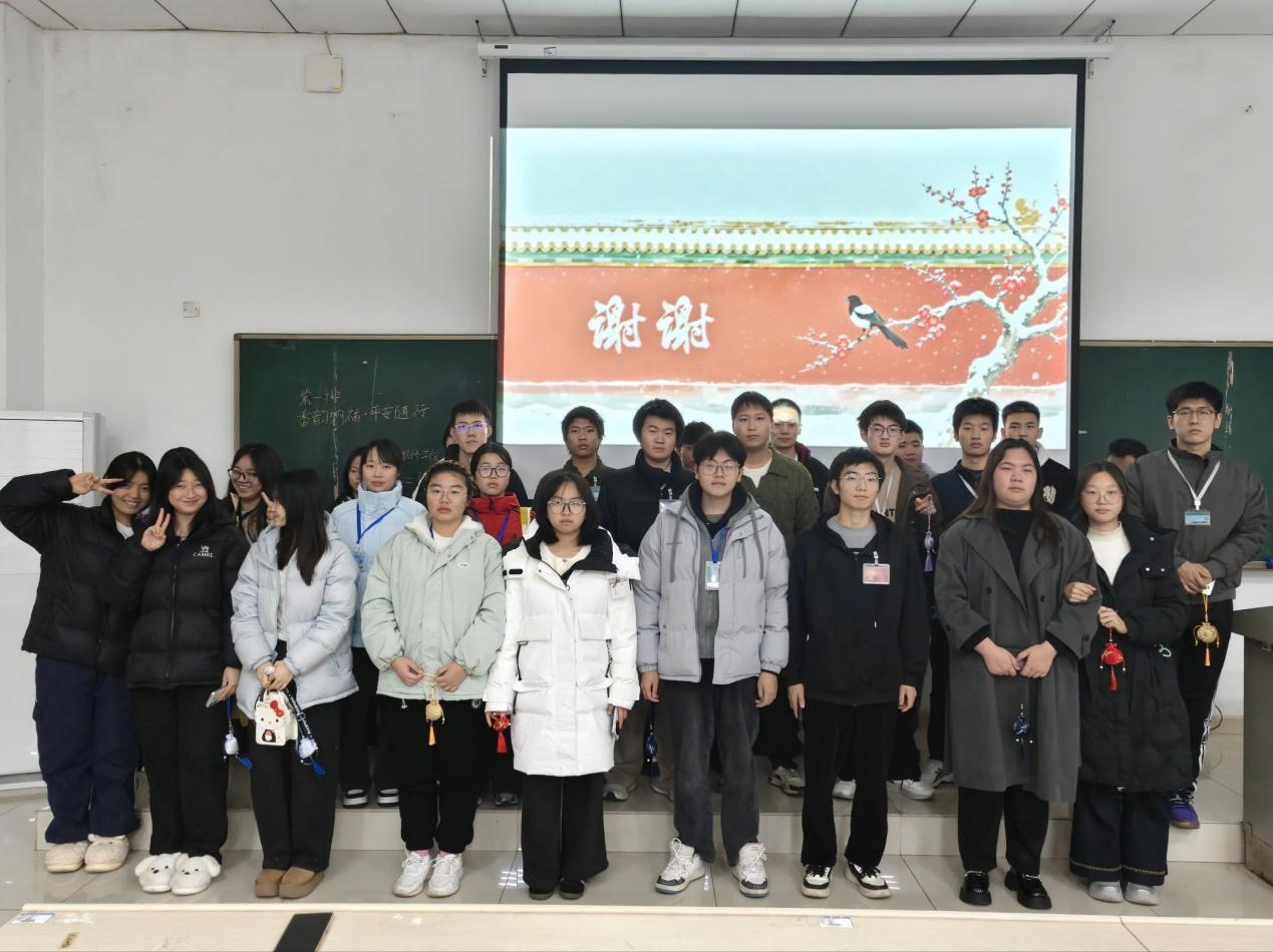 核心创作环节中,先通过成语接龙小游戏确定香囊袋选择顺序,同学们有序挑选后,工作人员分发香料包。在主持人的现场制作演示下,同学们清晰掌握香囊制作流程,随后投入沉浸式创作。同时,主持人分发小纸条,大家写下对明年的心愿并放入香囊,历经30 分钟,一个个承载 “时光胶囊”意义的专属香囊顺利完成。随后,同学们纷纷上台展示作品,分享今年的总结与明年的期望,活动最后,全体参与同学手持香囊合影留念,本次活动圆满落幕。