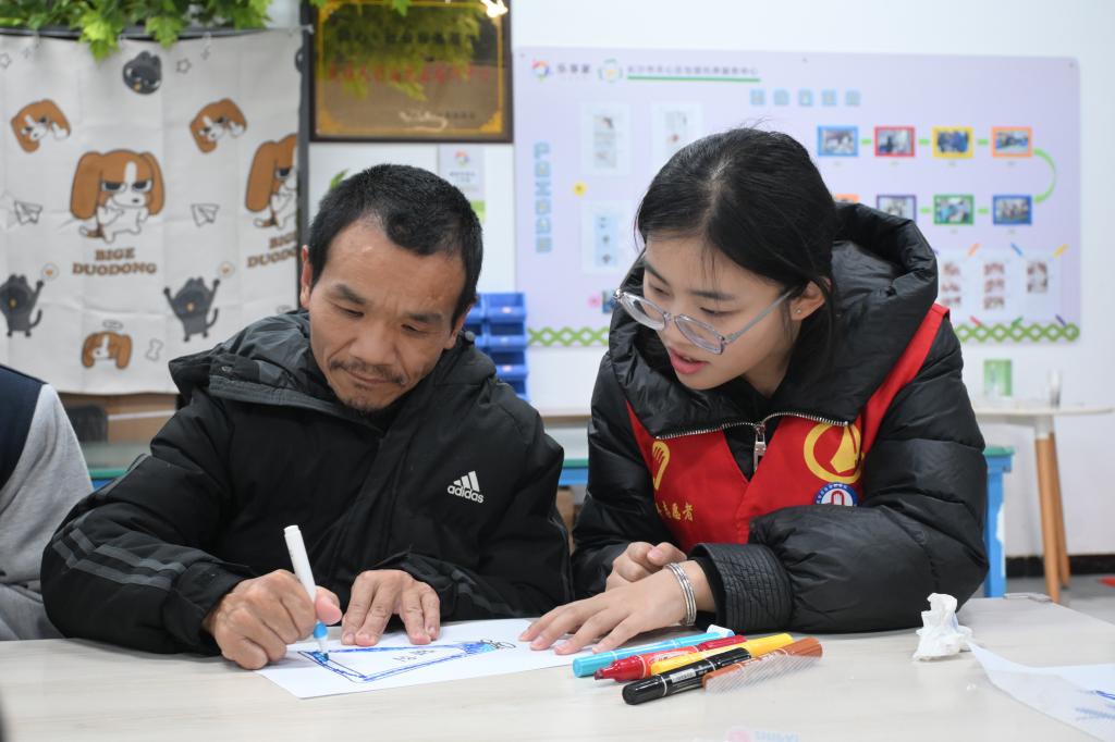 活动伊始,托养中心负责人发表致辞,对志愿队的到来表示热烈欢迎,志愿者代表详细介绍了活动流程,让现场氛围快速升温。志愿队为托养中心送去了米、油、面等生活物资,以实际行动传递对残障老人日常生活的关心与牵挂。结对陪伴环节中,“我心中的春天”绘画活动成为拉近彼此距离的纽带,志愿者们化身暖心伙伴,耐心协助残障老人递笔调色、轻握双手辅助创作,引导大家用斑斓色彩勾勒心中的春日盛景。笔尖流转间,鲜花、新叶、暖阳等元素跃然纸上,每一幅作品都承载着残障人士对美好生活的向往,更定格了残健同心、守望相助的温情瞬间。绘画落幕,击鼓传花游戏点燃现场活力,志愿者登台献唱、传递祝福,残障老人们则以一曲手语舞蹈《感恩的心》深情回应,纯真的笑容、整齐的动作,将质朴的感恩之情传递给在场每一个人,温情在空气中静静流淌、浸润人心。
