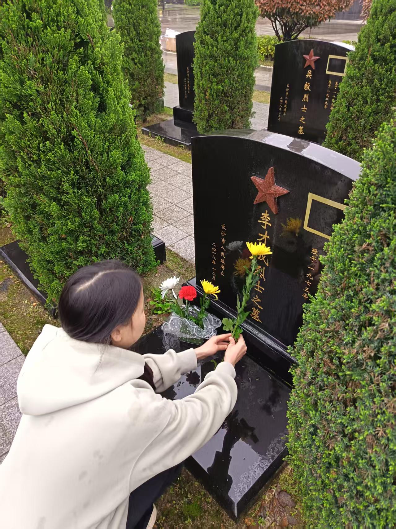活动当天,同学们身着整洁衣服,手持鲜花与清洁工具,怀着崇敬肃穆的心情有序步入烈士陵园。苍松翠柏掩映下,烈士纪念碑巍峨矗立,诉说着革命先辈为国家独立、民族解放、人民幸福抛头颅、洒热血的峥嵘岁月。在庄严的纪念碑前,全体同学整齐列队,低头默哀,深切缅怀为民族大义英勇献身的革命先烈,表达对英雄们的无限哀思与崇高敬意。随后,同学们依次缓步上前,将手中洁白的鲜花轻放于纪念碑前,鞠躬致敬,用最质朴的方式寄托追思,铭记先烈们的英勇事迹与奉献精神。祭拜仪式结束后,同学们迅速化身志愿公益者,分工协作开展陵园卫生清理公益行动。用实际行动守护烈士陵园的庄严肃穆,为先烈们营造干净整洁、安宁肃穆的安息环境。
