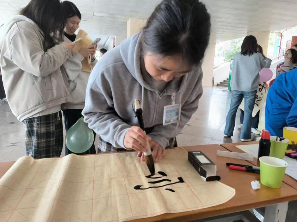 活动现场墨香氤氲、氛围雅致,精心布置的书法展示区、创作区与互动区,成为第二教学楼大厅一道独特的文化风景线,有效吸引了过往学生停下脚步、参与其中。活动伊始,工作人员通过“数字炸弹”“你画我猜”等趣味互动游戏,主动邀请路人参与,在轻松愉悦的氛围中拉近了与参与者的距离,也为后续的书法创作营造了融洽和谐的氛围。随后,无论是自带基础的书法爱好者,还是初次尝试的同学,都纷纷接过笔墨,凝神静气、挥毫泼墨,或端坐静思斟酌字形,或伫立案前舒展笔墨,一笔一划间尽显专注与热忱,每一份认真都彰显着对书法艺术的好奇与喜爱。