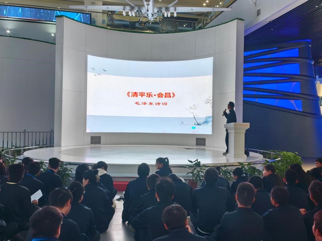 教学展示活动以毛泽东诗词为载体,以中国共产党领导的革命和建设伟大实践为主线,各学习小组依次登场,通过诵、唱、舞、情景剧等形式感悟伟人情怀,传承革命精神,弘扬红色文化。展示过程中,启航组的张馨文同学表示:“毛主席的诗词不仅词句优美,更传达了革命志士对国家和人民的无限忠诚。尤其是今天我们站在歼8战机的面前展示,我更加能够深刻体会到机务人员在蓝天中的使命感和责任感。”奋进组的高涵同学提到:“在诵读《沁园春·长沙》的过程中,我体会到了气魄与豪情,这鼓舞我在未来的学习中不断追求卓越,勇于付出。”