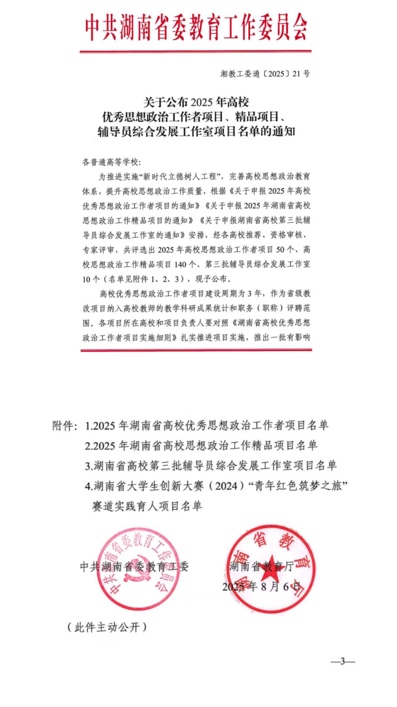 20250808(1-)-附件1-湘教工委通【2025】21号++关于公布2025年高校优秀思想政治工作者项目、精品项目、辅导员综合发展工作室项目名单的通知.pdf